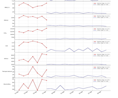 Figure: Air-quality parameter trends showing significant improvement post Air Purifier installation.